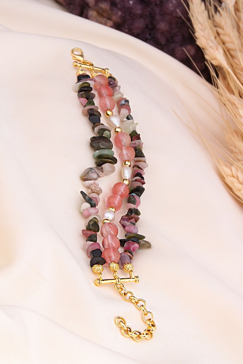 Bracelet multi rangs serti de tourmalines, de quartz et de 3 perles d’imitation.