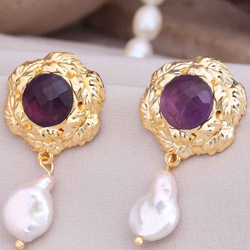 Boucles d'oreilles - Laiton plaqué or, améthyste & perle