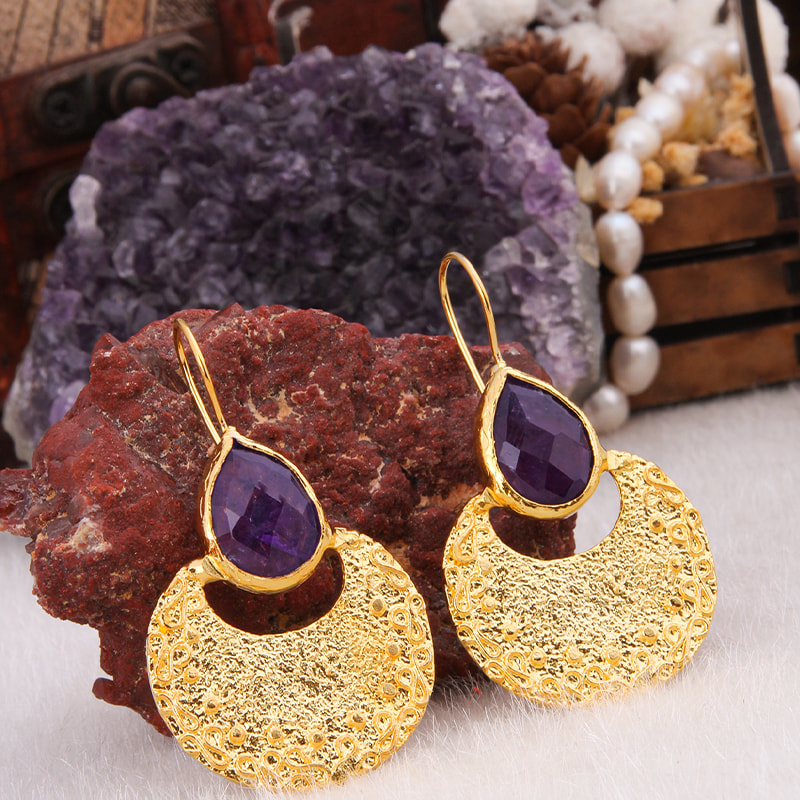 Craquez pour ces boucles d'oreilles pendantes en laiton plaqué or, sublimées par du violet éclatant. Élégantes et légères, elles apporteront une touche de glamour et de sophistication à toutes vos tenues !