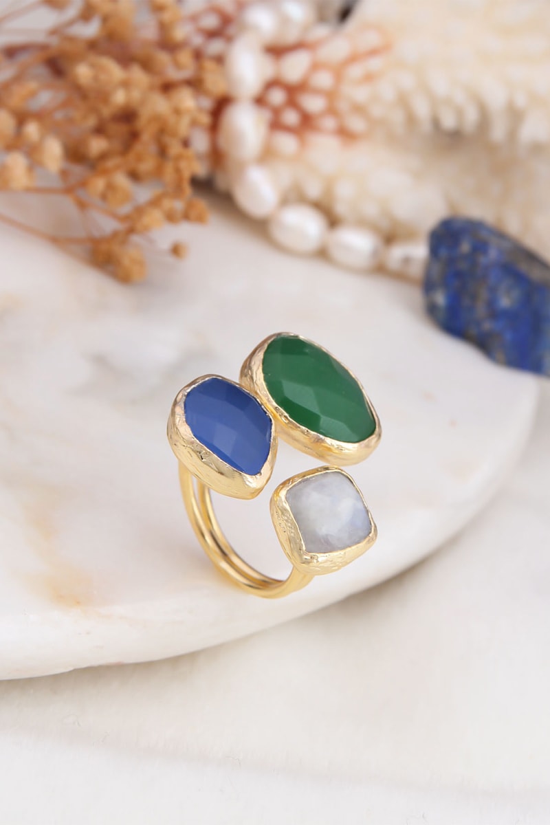 Bague en plaqué or jaune sertie de pierre de lune et œils-de-chat.