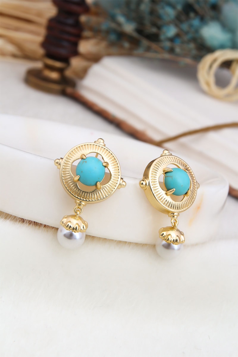 Boucles d’oreilles serties d’une turquoise et d'une perle d’imitation.