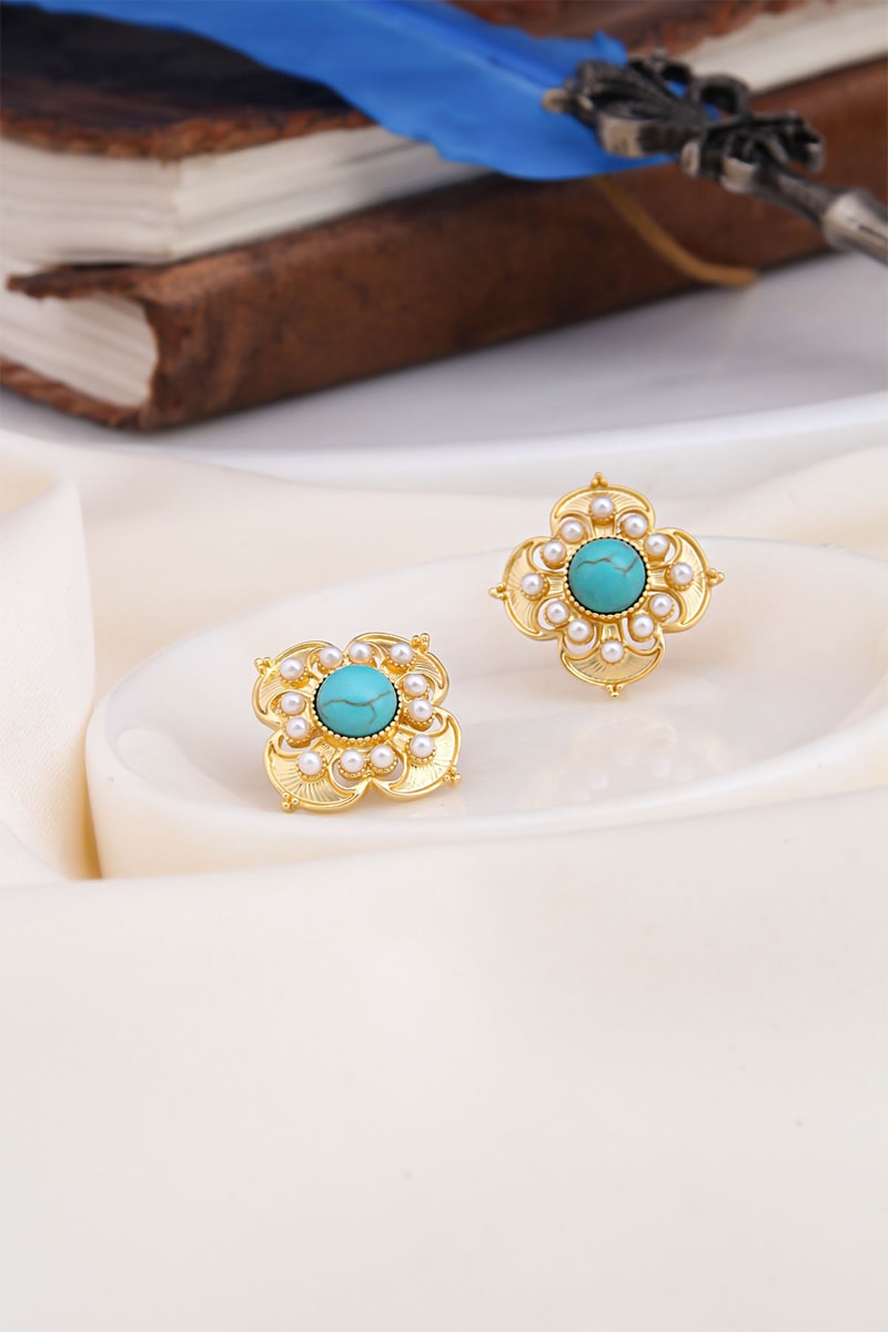 Boucles d’oreilles serties d’une turquoise et de perles d’imitation.