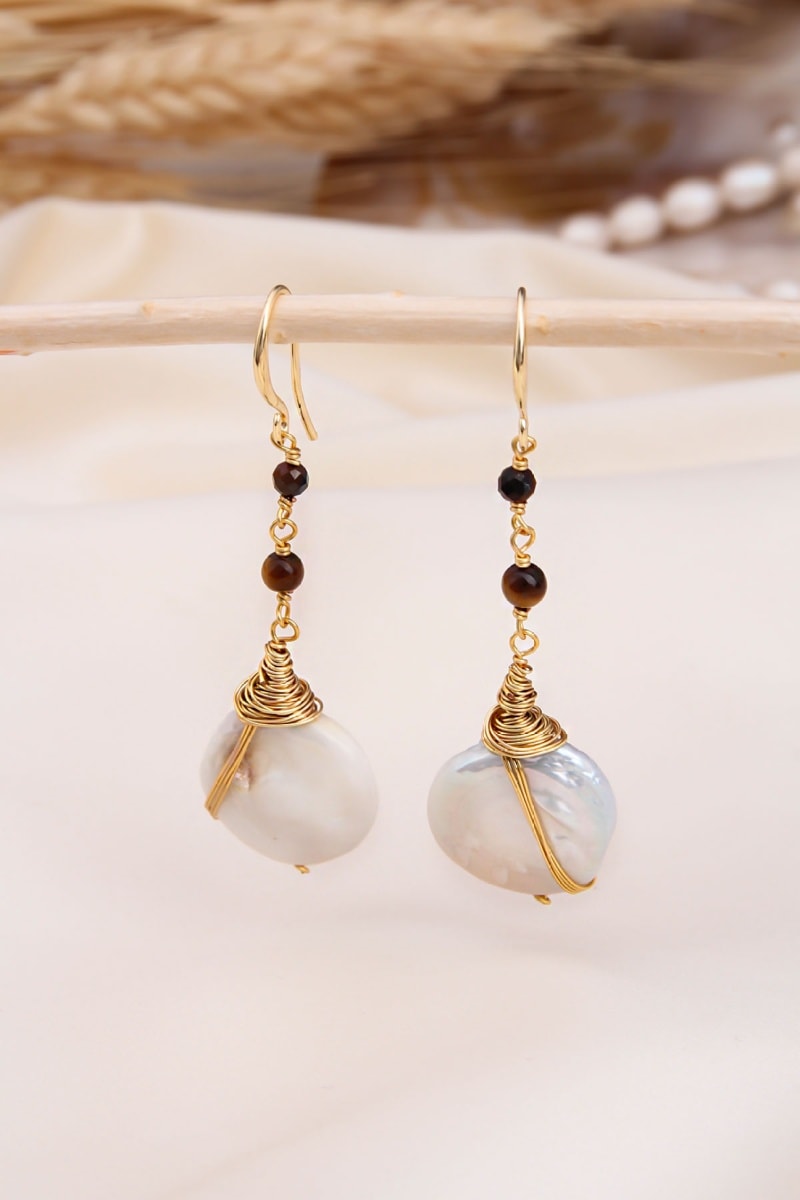 Boucles d'oreilles - Plaqué or jaune, œils-de-tigre et perles de culture