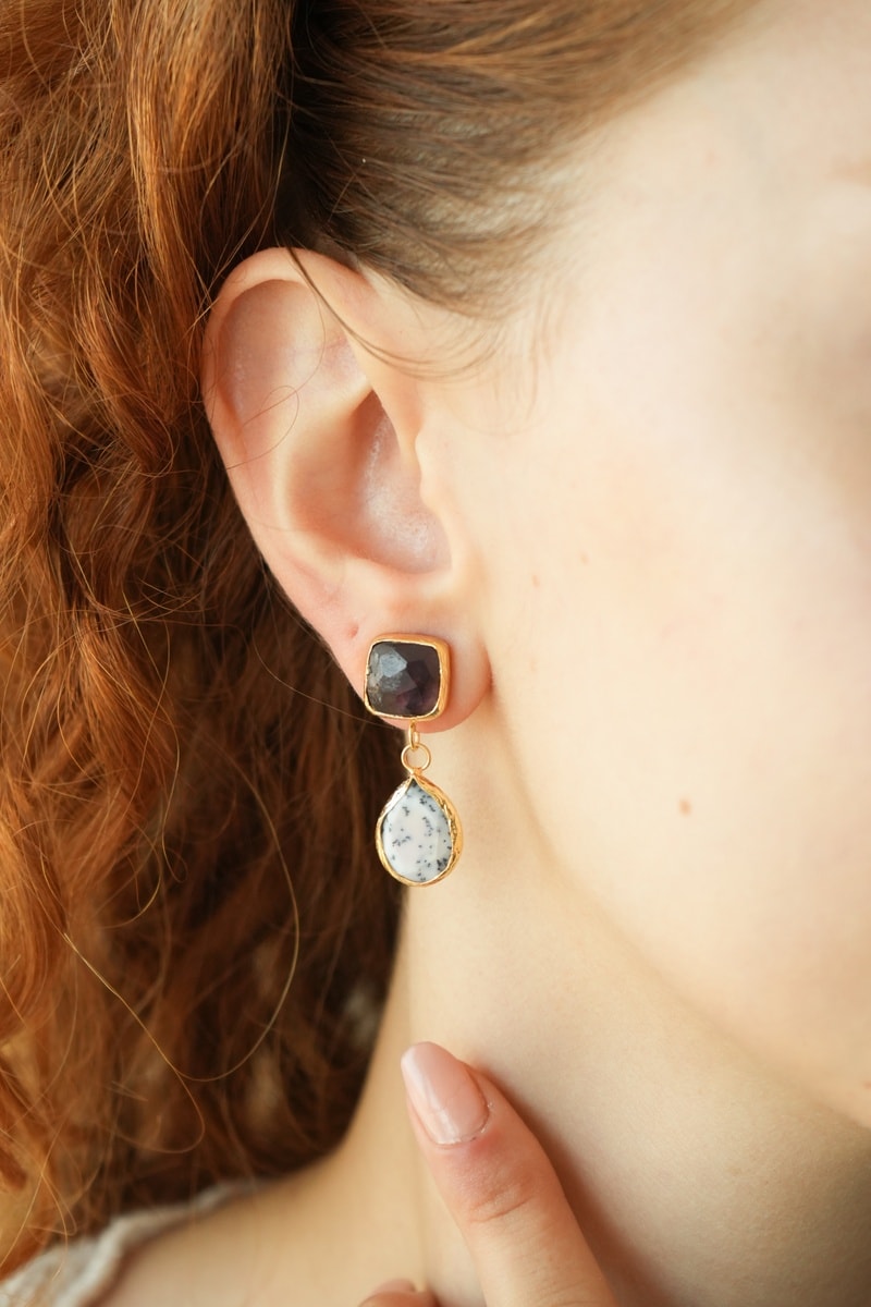 Boucles d'oreilles pendantes serties d'une améthyste et d'une dendrite.