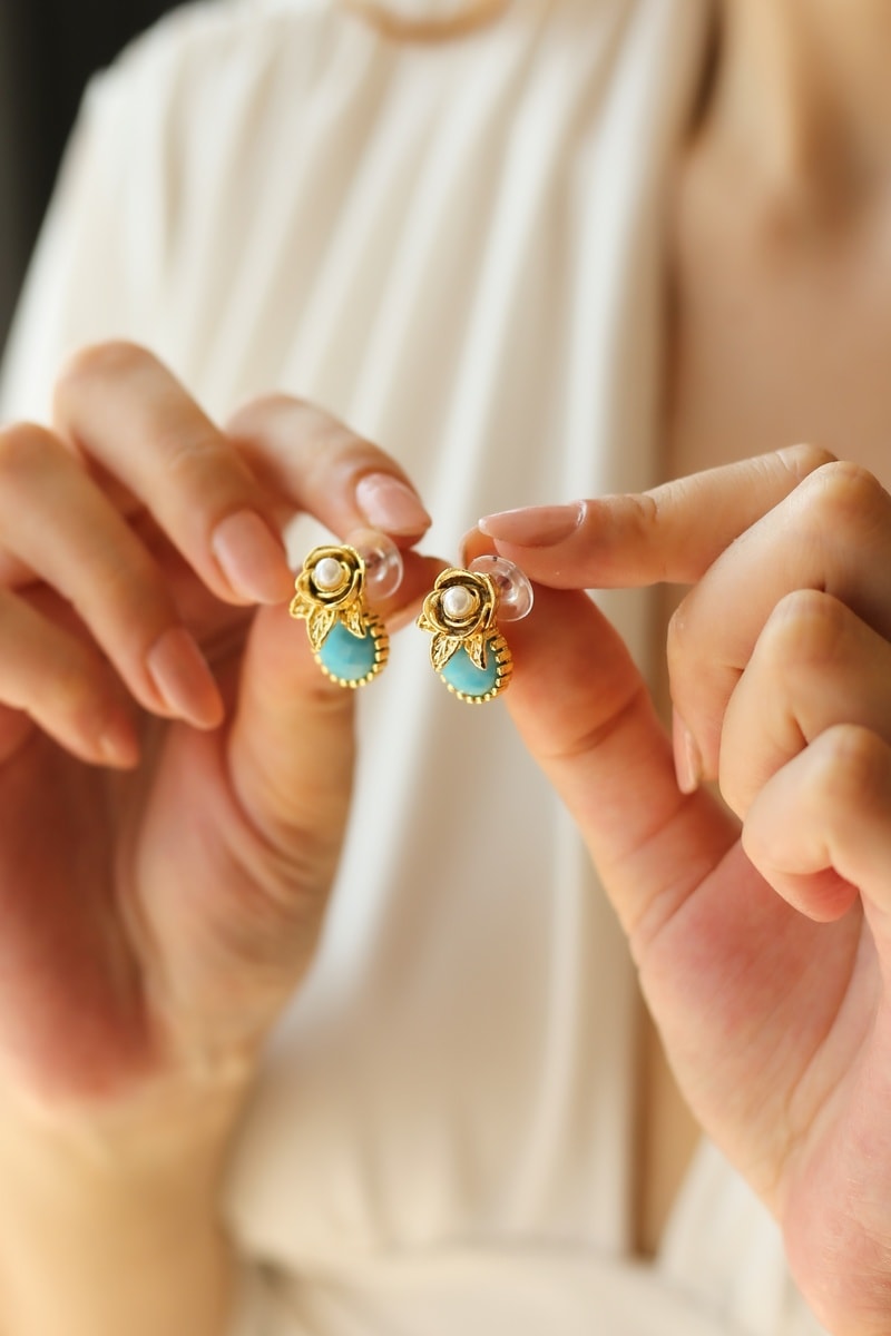 Puces serties d'une turquoise et d'une perle d'imitation.