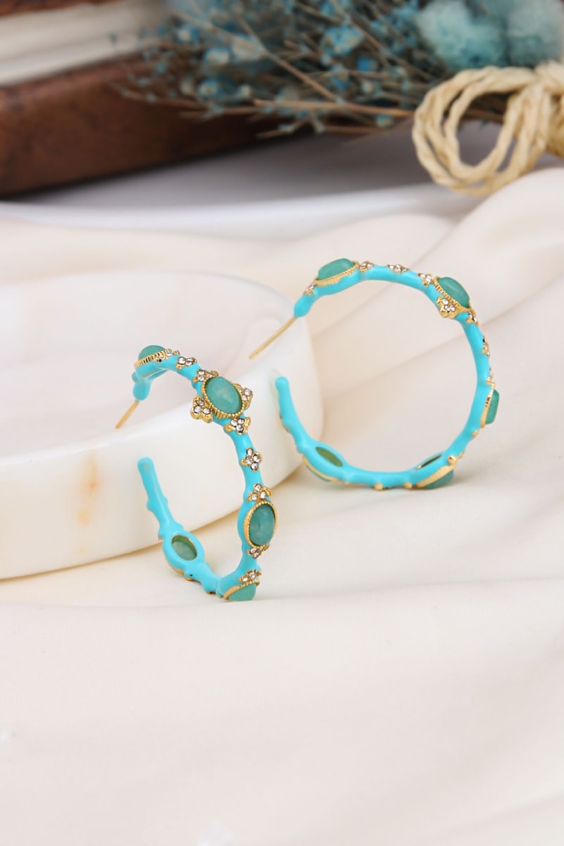 Demi-créoles en plaqué or jaune serties d’amazonites et de zircons.
