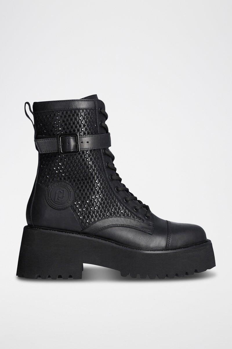 Fermeture à lacets, zippée et par bride à boucle sur le côté.