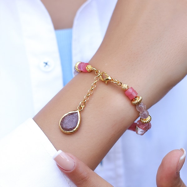 Bracelet doré à l'or fin jaune serti de quartz rose.