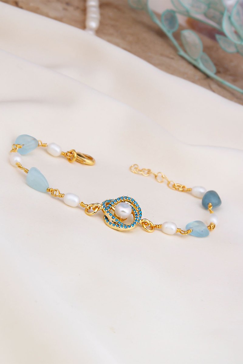 Bracelet serti de 4 aigues-marines, de perles d’imitation et de cristaux.