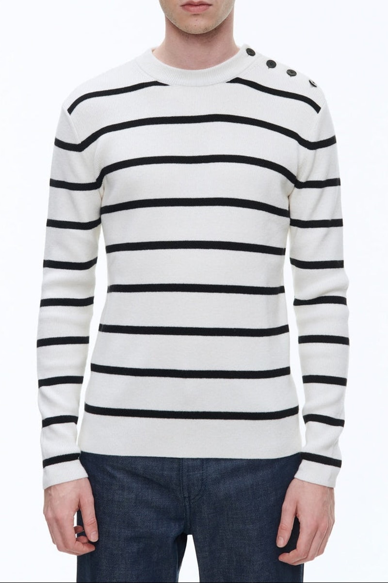 Pull à rayures en laine et coton, conçu pour l'élégance discrète, avec une coupe classique et des rayures écrues et noires.