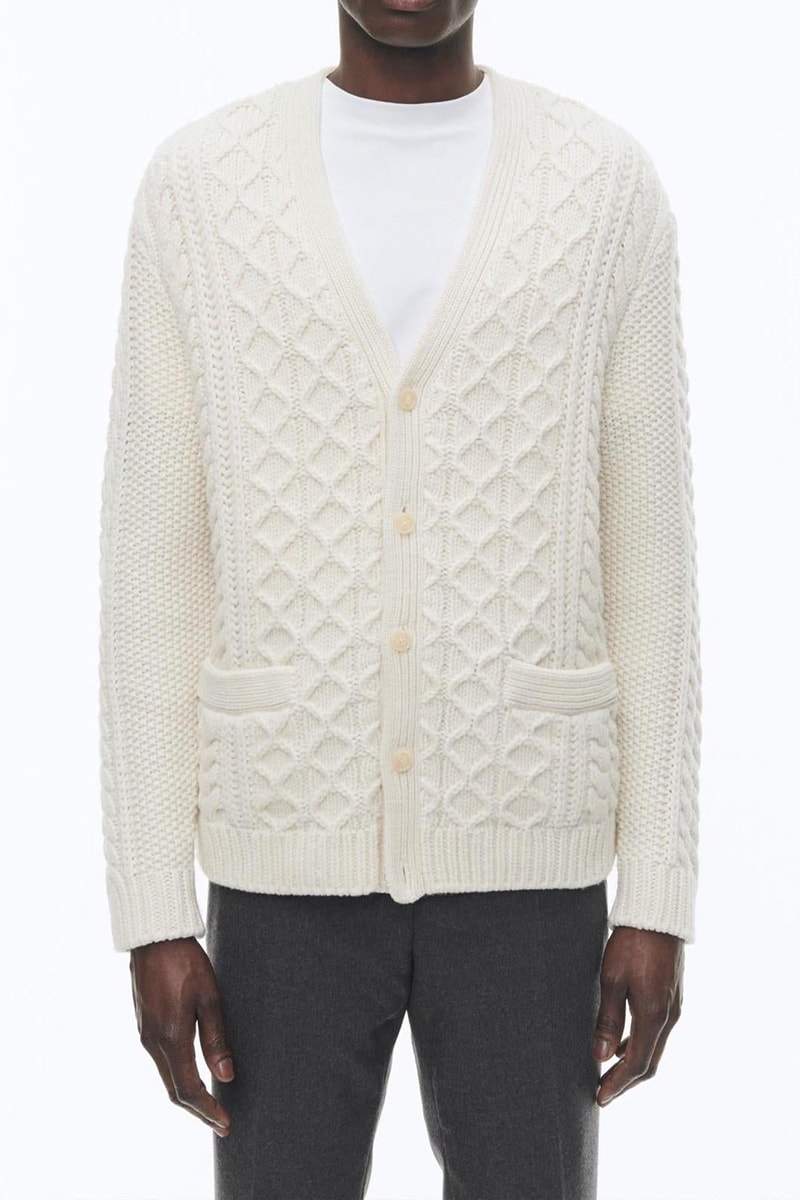 Cardigan au style intemporel, ce cardigan torsadé en laine présente une maille épaisse et torsadée, un col V élégant et une patte de boutonnage à 5 boutons.