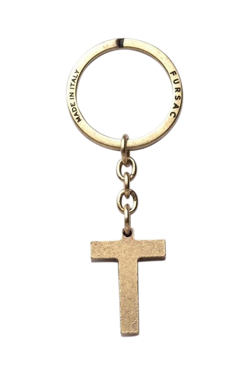 Porte-clés en laiton doré, représentant la lettre T, d'une hauteur de 2,5 cm.