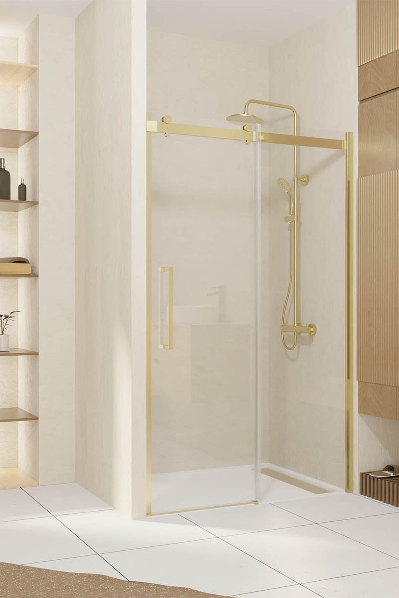 La porte est coulissante grâce à un roulement à galet doré. La porte de douche embarque un système de fermeture « soft-close », qui permet une fermeture douce.