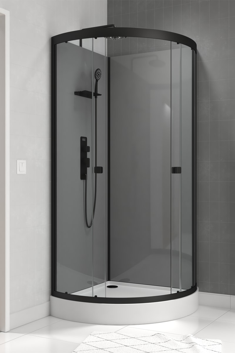La structure 1/4 de cercle en aluminium laqué noir mat souligne les formes arrondies de la cabine de douche Foggy.