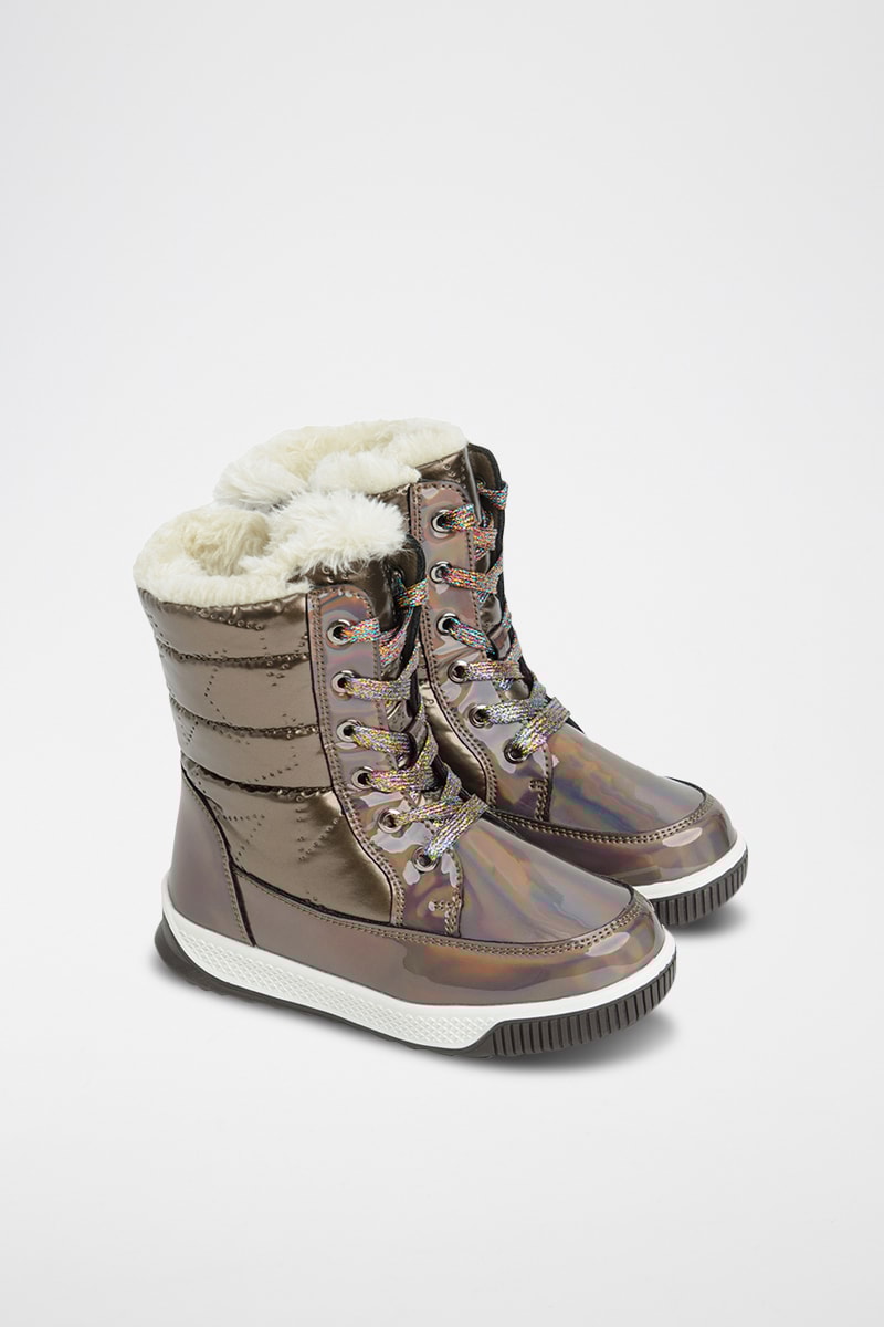 Fermeture à lacets devant, zippée et par scratch sur le côté.