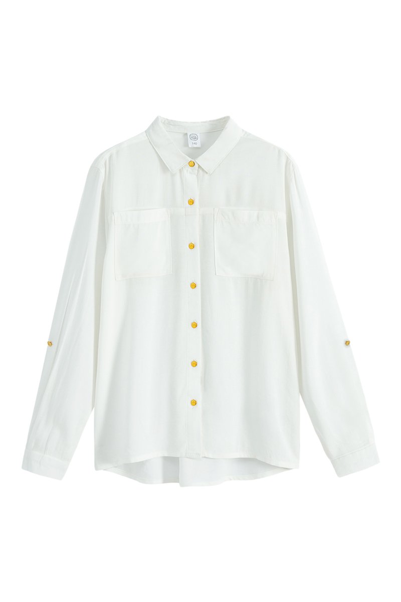 Chemisier à manches longues retroussables par patte boutonnée.