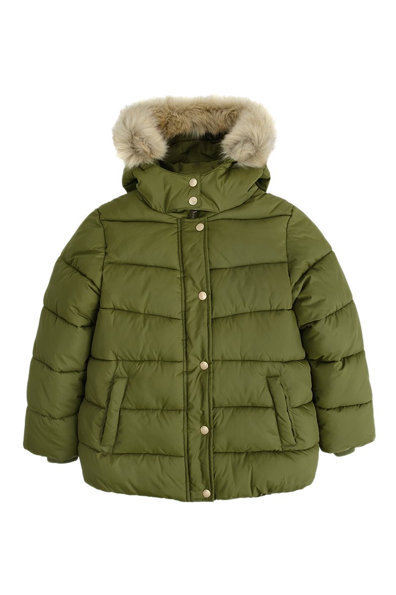 Doudoune à capuche pressionnée avec fourrure synthétique amovible.