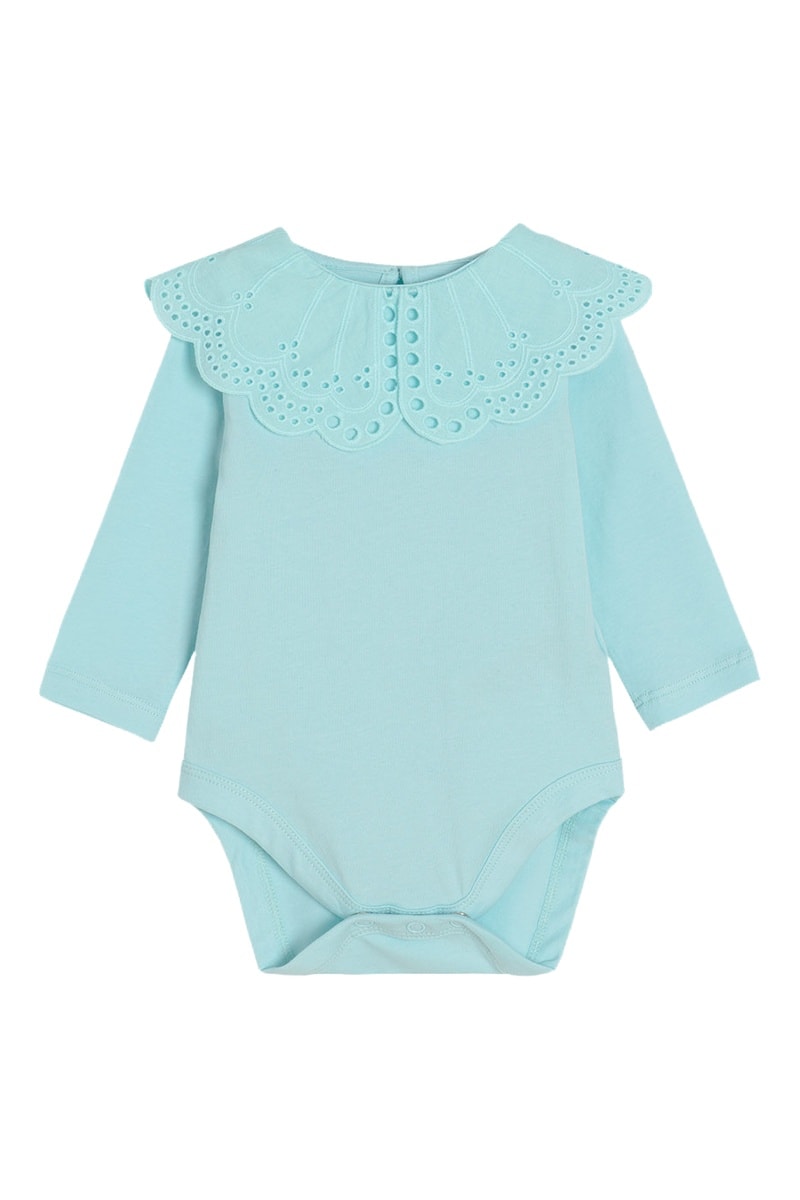 Fermeture pressionnée à l’entrejambe et par goutte boutonnée au dos.