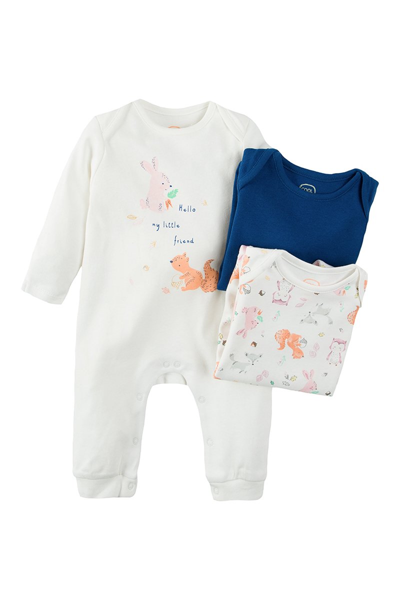 3 grenouillères dont 1 à motifs fantaisie et 1 avec lettrage et motifs fantaisie devant.