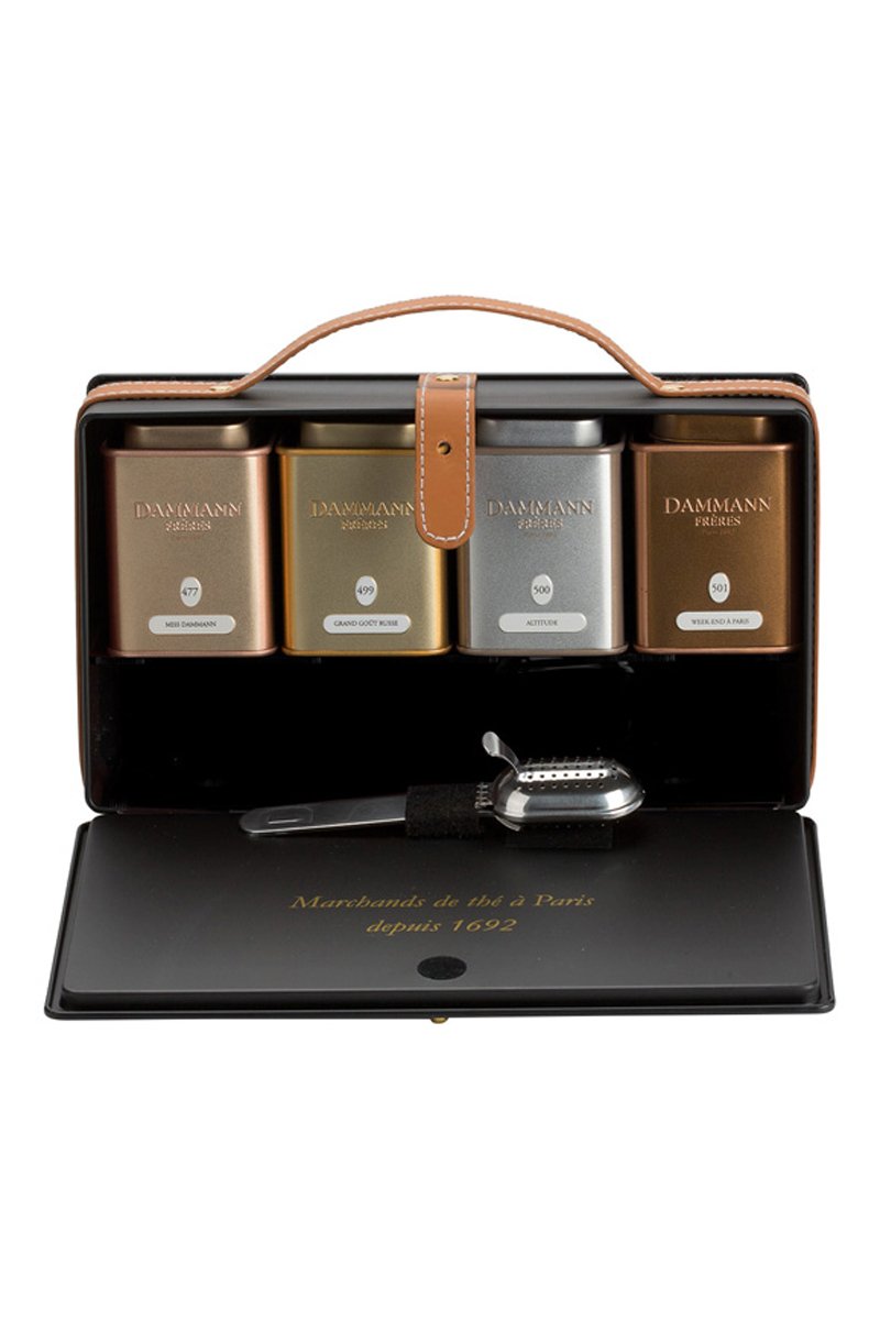 Ingrédients : GRAND GOUT RUSSE : Thé noir (Camellia sinensis), arôme citron caviar et huile essentielle de bergamote, écorces de bergamote, pétales de fleur / ALTITUDE : Thés noirs (Camellia sinensis) / MISS DAMMANN : Thé vert (Camellia sinensis), morceaux de gingembre, huile essentielle de citron vert et arôme fruit de la passion, pétales de fleur / WEEK-END A PARIS : Thé Oolong (Camellia sinensis), arômes (fleurs de cerisier et de pêcher, amande) et huile essentielle de rose, pétales de fleur.