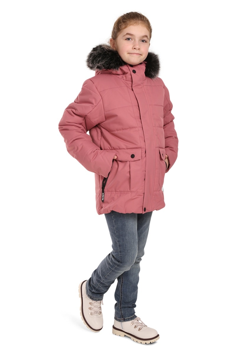 Doudoune à capuche avec fourrure synthétique amovible, liens de serrage et patte à scratch.