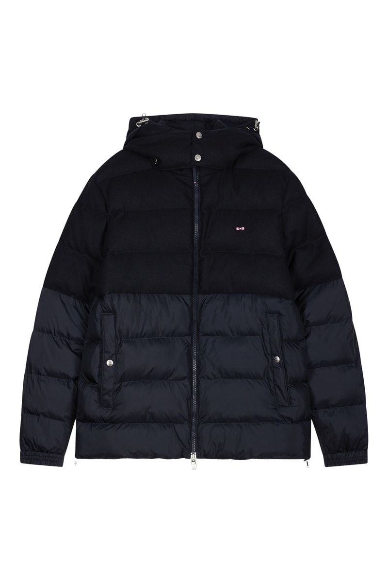 Doudoune à capuche avec liens de serrage, barillets et patte pressionnée.