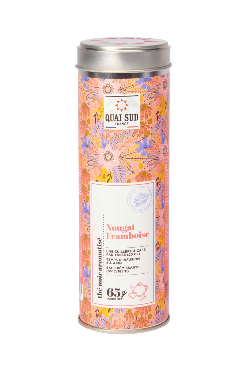 Ingrédients : thé noir de Chine, éclats de nougat de Montélimar 5,4% (amandes grillées (fruits à coque), sucre, sirop de glucose, miel, graisse végétale hydrogénée (coprah), albumine d'œuf, fécule de pomme de terre (gluten), arôme naturel vanille), morceaux de framboise (framboises, sucre, E202, E509, acide citrique, huile de tournesol, dextrose) 3,4%, arômes (framboise 1,7%, noisette), arômes naturels goûts caramel et amande.