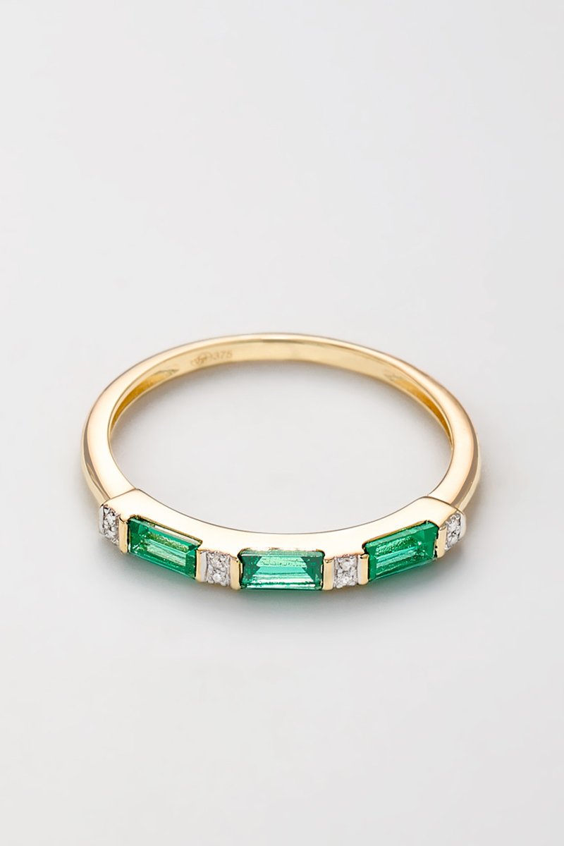 Bague en or jaune sertie de 8 diamants et de 3 émeraudes.