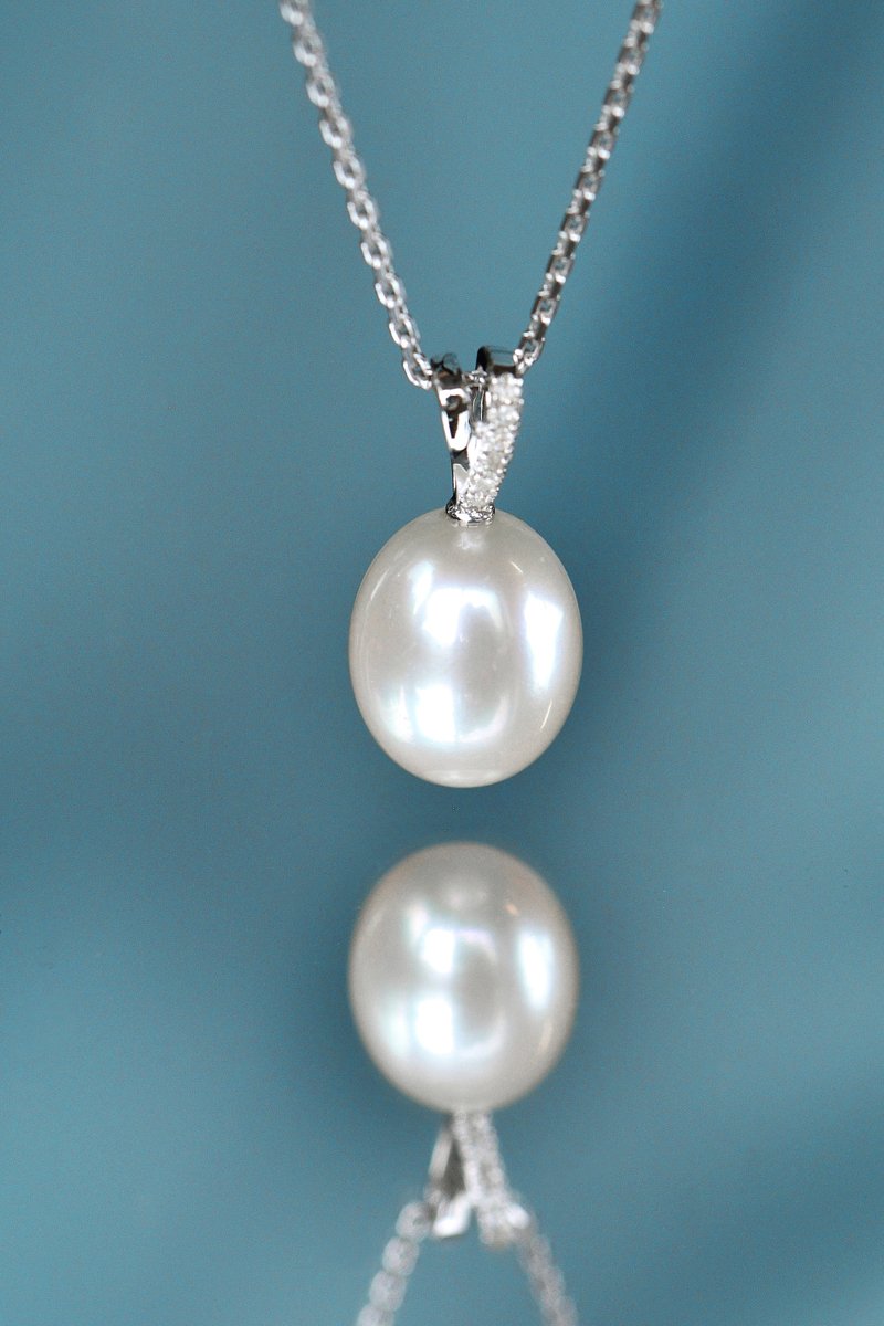 Pendentif en or blanc serti de 6 diamants et d'une perle d’imitation.
