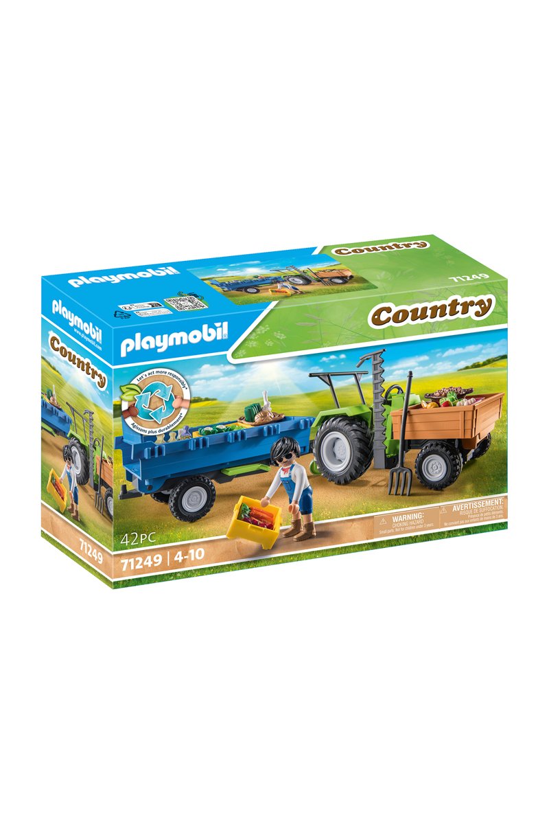42 accessoires tels que : figurine, tracteur avec remorque, quatre briques de jus, légumes, caisses de transport, fourche, paniers.