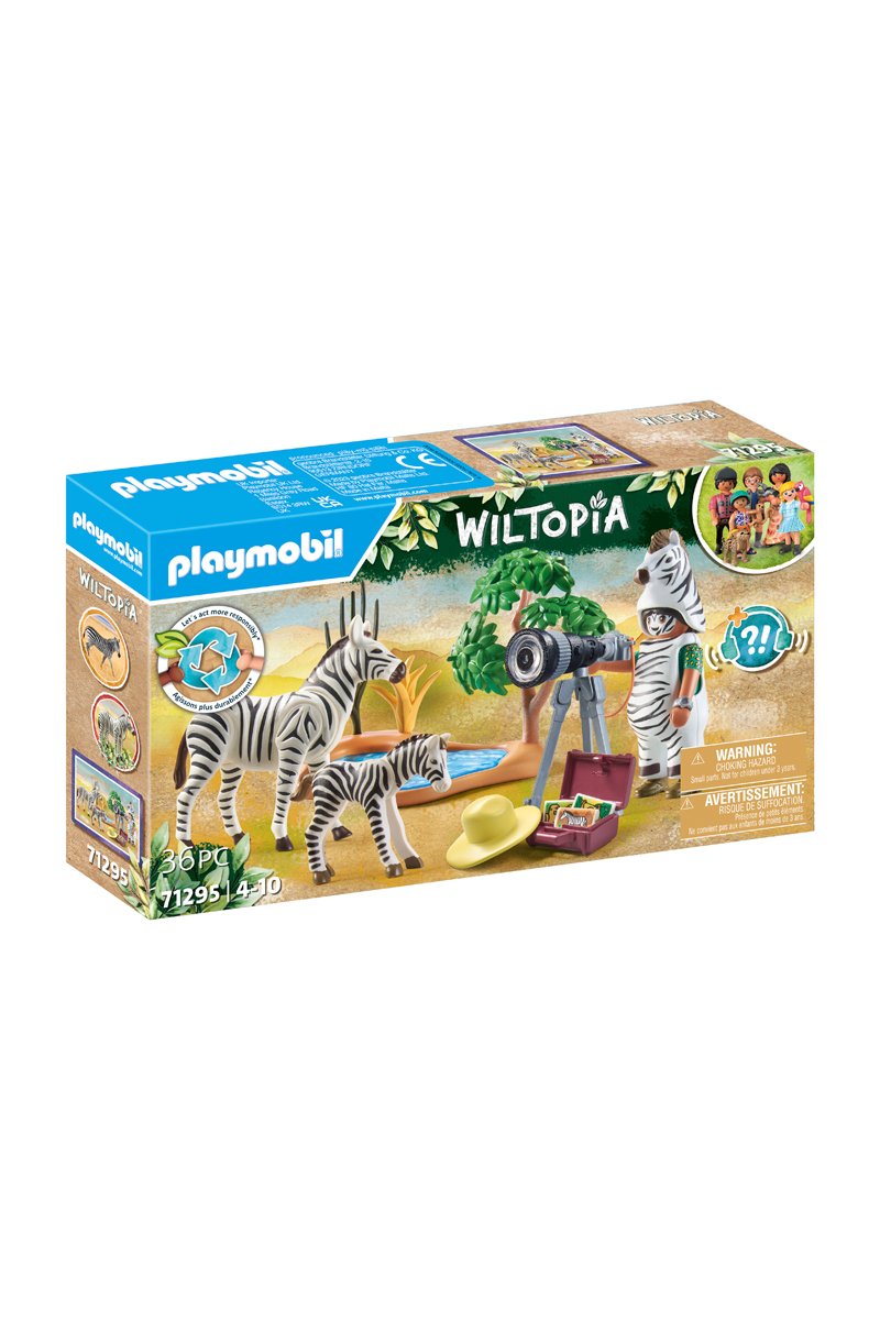36 accessoires inclus tels que : figurine de photographe avec un double visage, costume, zèbre adulte, poulain, point d'eau, appareil photo, chapeau, mallette.
