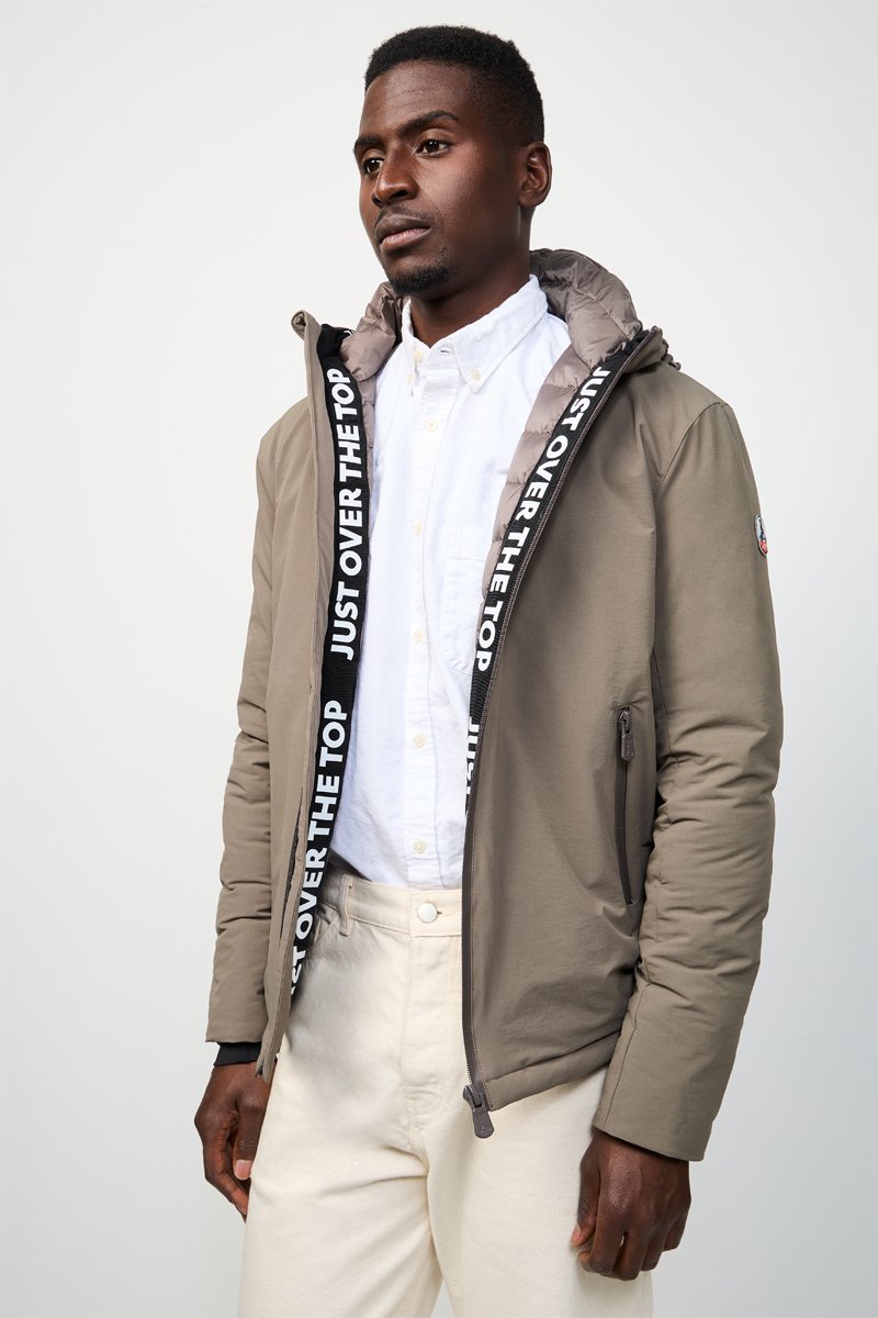 Veste à capuche avec liens de serrage en duvet et plumes de canard.