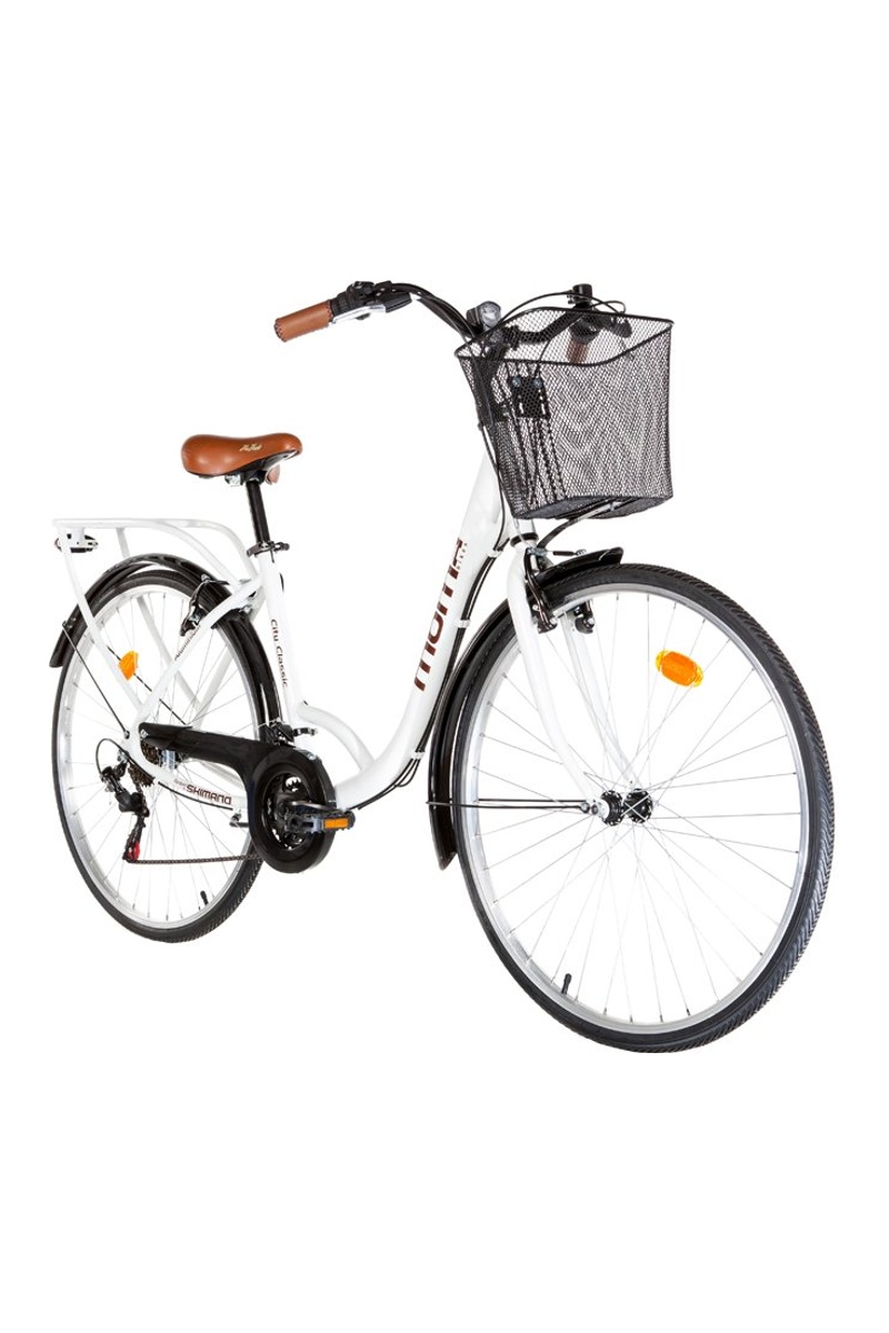 Équipé d'une béquille, d'une sonnette, d'un protège-chaîne, garde-boue et d'un petit panier avant pour transporter de petits objets.