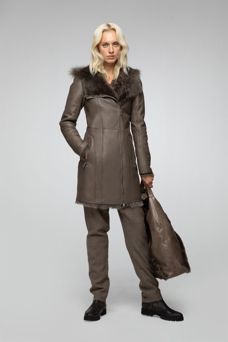 Manteau à capuche en peau lainée de mouton - Marron