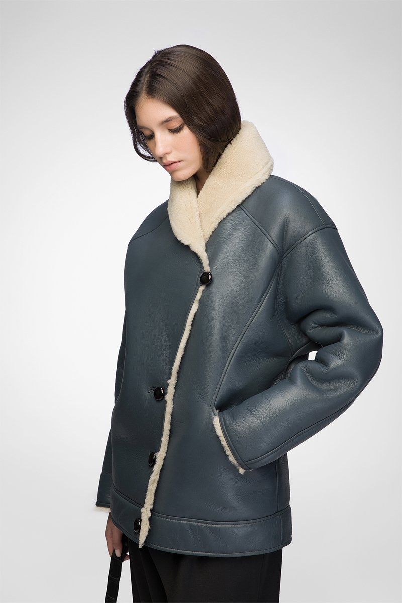 Manteau en peau lainée de mouton - Bleu