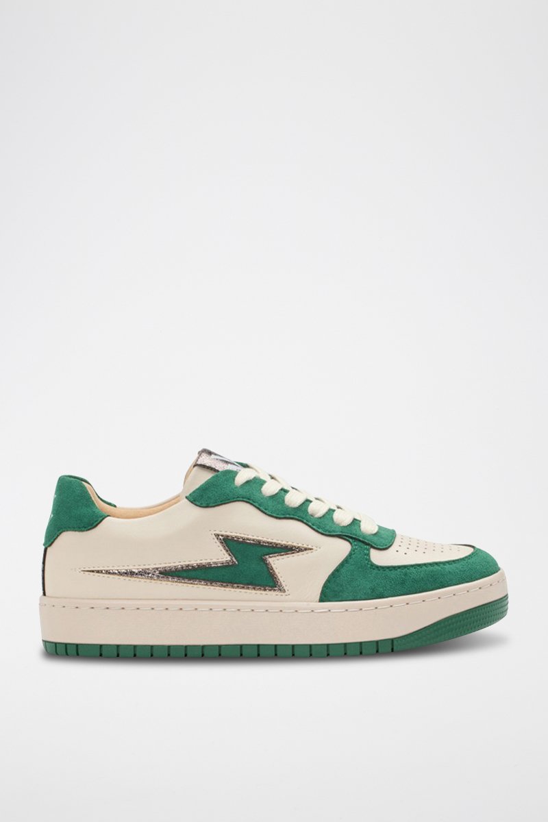 Découpe en forme d'éclair en suédine avec bordures en similicuir texturé.