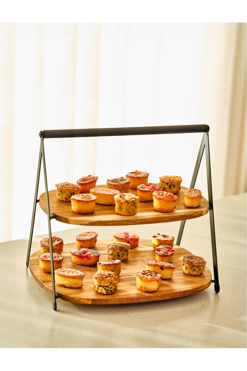 Etagère ovale sur pied en bois d’acacia.