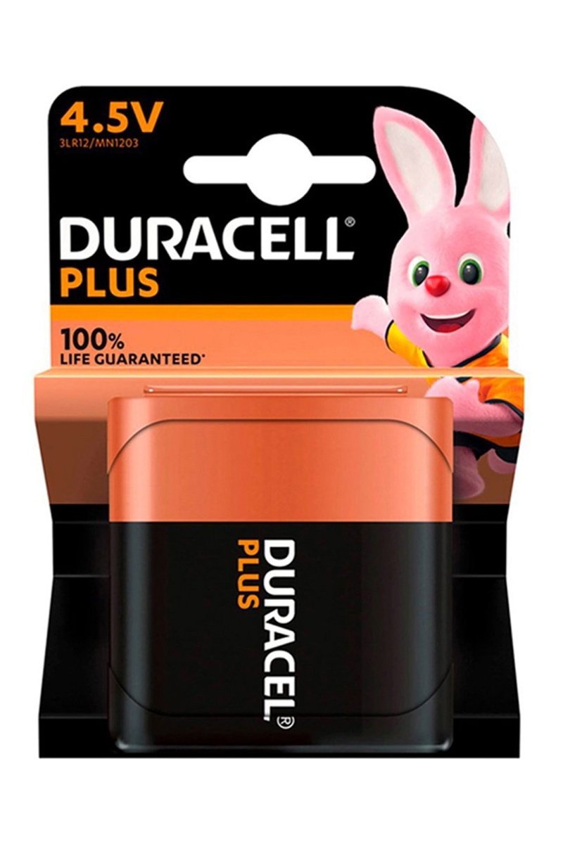 La pile alcaline 4,5V Duracell Plus offre une durée de vie garantie à 100 %* (*garantie commerciale comparée à la durée moyenne minimum dans les tests standards IEC 2015 pour les piles de format 4,5V.