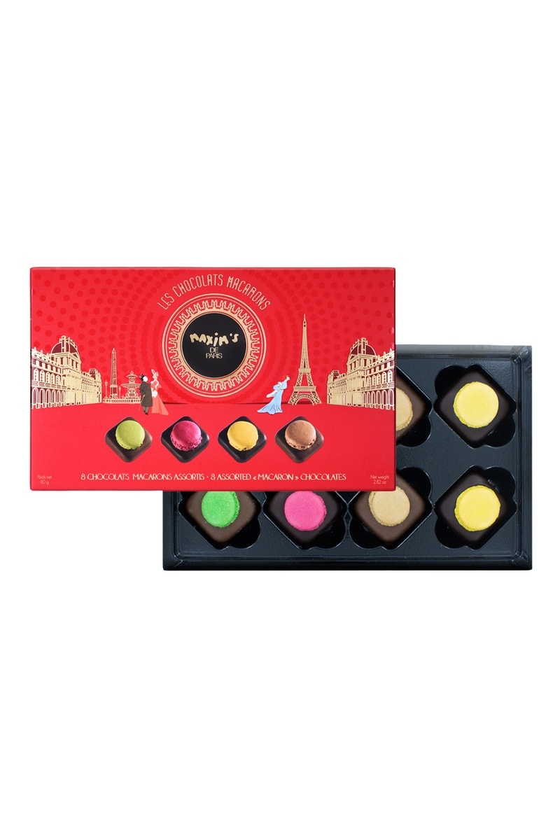 A travers ce nouvel étui, Maxim’s célèbre le mariage gourmand du macaron et du chocolat dans un étui de 8 chocolats fins couronnés d’une authentique coque de macaron.