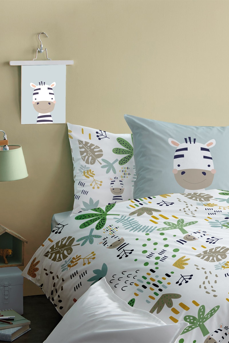 Motifs zèbre et feuillage dans les tons verts, beige et bleu.