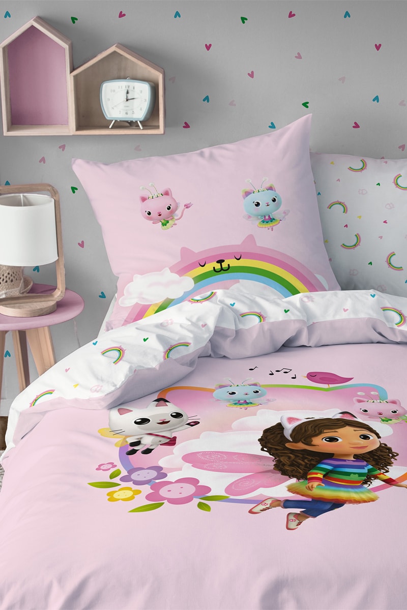 Motifs arcs-en-ciel, cœurs, pattes et personnages de Gabby et La Maison Magique sur fond rose et blanc, réversible pour varier les ambiances.