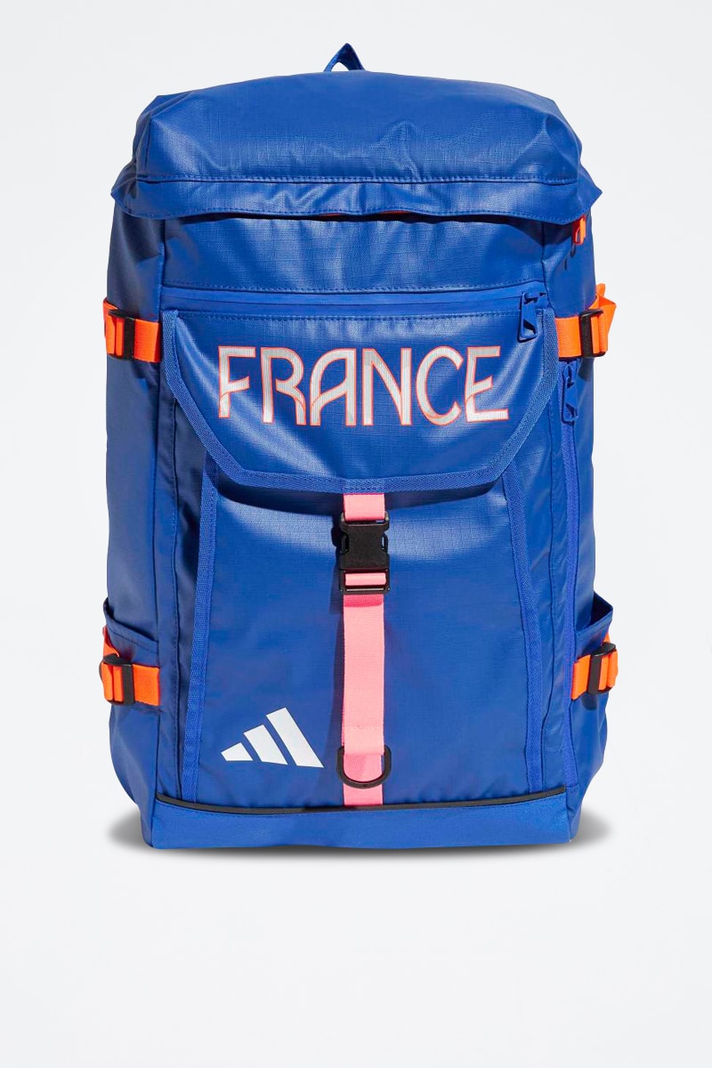 3 poches : 2 zippées, 1 à rabat avec sangle, fermeture à clip et logo.