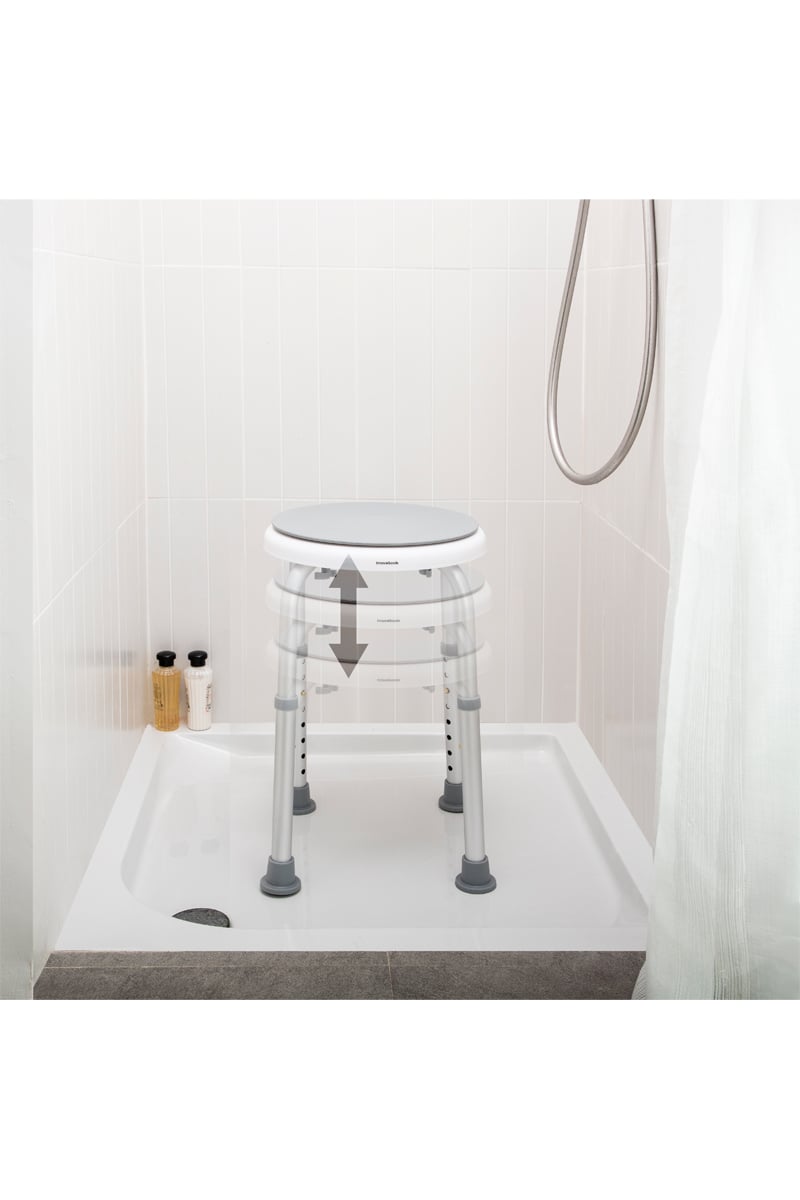 Siège pivotant : ce tabouret de salle de bain réglable dispose d’une assise pivotante à 360º.