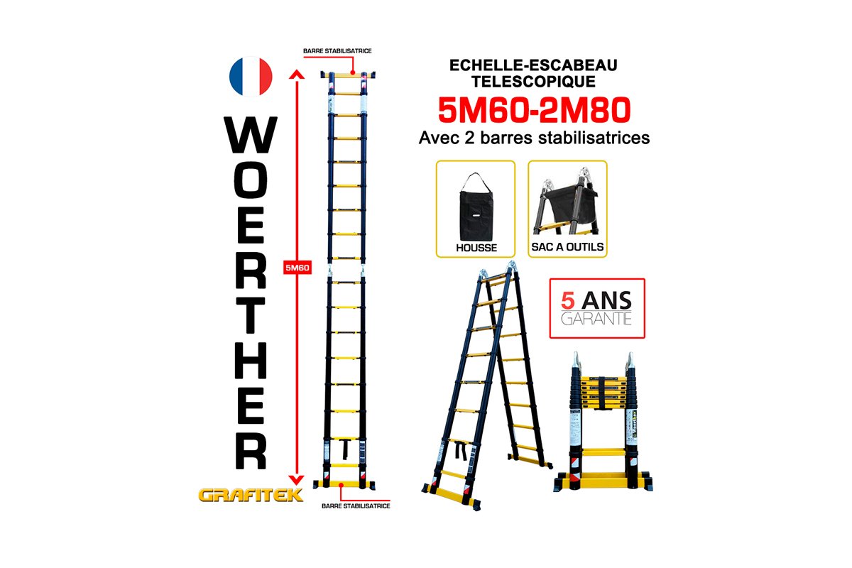Echelle-escabeau télescopique Grafitek, housse et sac porte-outils - 5,60 m et 2,80 m