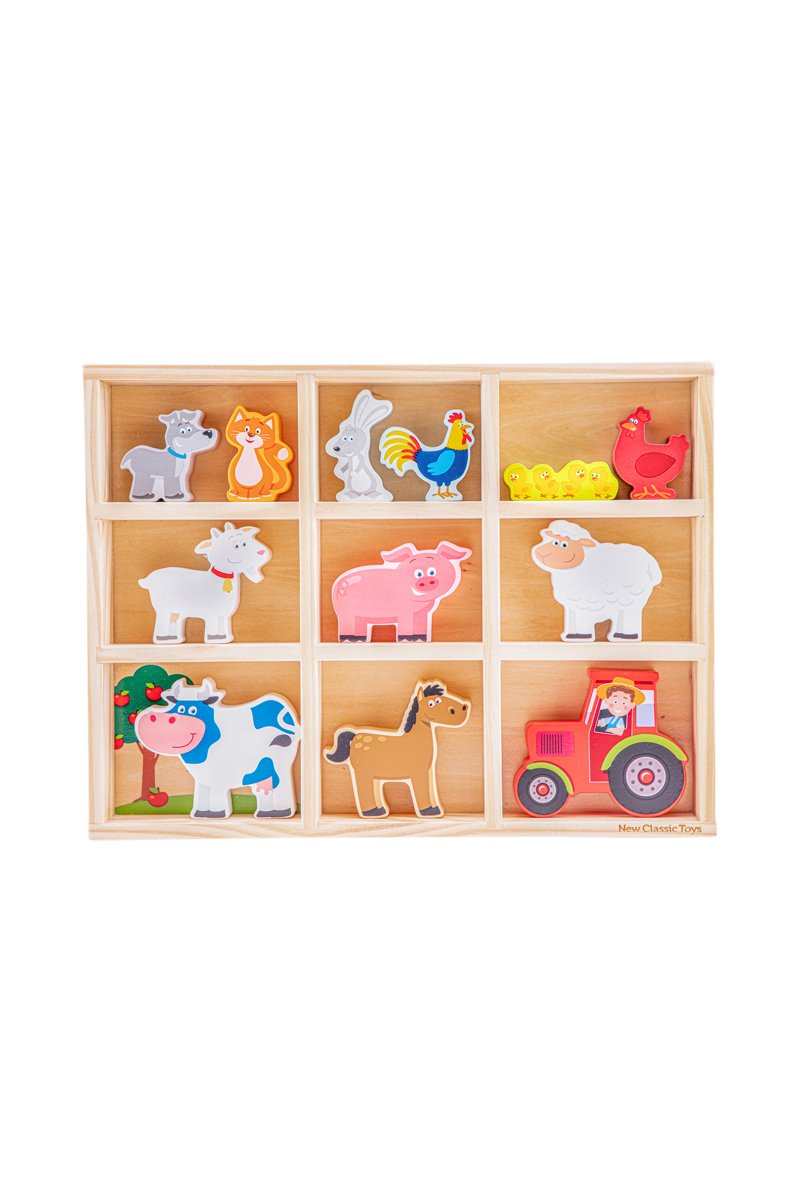 Boîte avec 9 compartiments en bois comprenant 12 figures d'animaux de la ferme en bois.