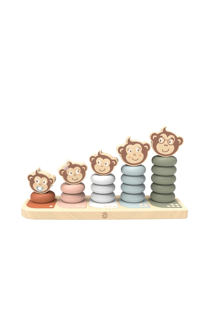 5 singes empilables représentant les membres d’une famille : père, mère, frère, sœur et bébé.