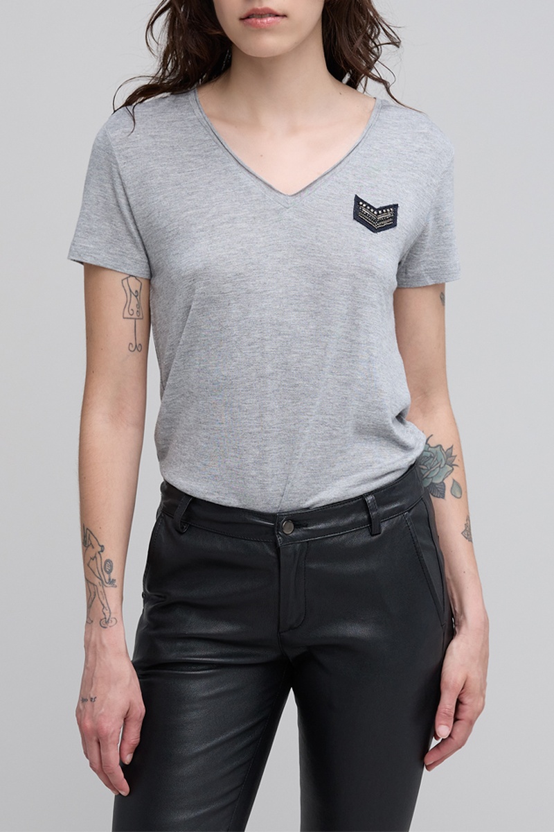 Ecusson avec perles décoratives et empiècements en métal devant.