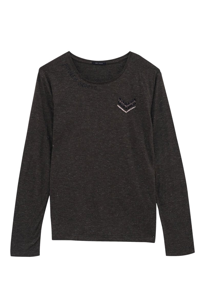 Lettrage brodé et motifs chevrons en perles décoratifs devant.