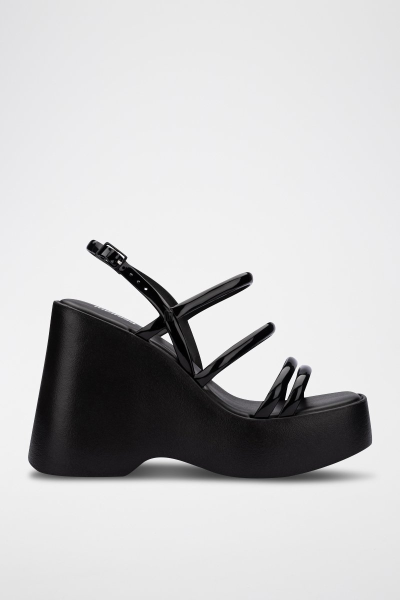 La Melissa Jessie Platform, c'est LA sandale qui vibre au rythme de la tendance des plateformes super hautes. Avec ses cinq fines lanières sur le cabedal, dont quatre sur le coup de pied et une à l'arrière, elle assure un maintien parfait grâce à sa fermeture à boucle. Légère et confortable, elle est l'alliée idéale pour te suivre tout au long de la journée, te gardant perchée avec son talon de 11,5 cm. Mais grâce à sa plateforme à l'avant, tu auras l'impression de marcher sur un talon bien plus bas. C'est le choix parfait pour un look cool, avec une touche rétro et fashionista !La sandale Melissa Jessie Platform est fabriquée en plastique PVC Melflex® et EVA. Elle possède un bout arrondi, quatre fines lanières sur le coup de pied et une lanière à l'arrière avec une fermeture à boucle. Sa plateforme en EVA super légère est plus haute à l'arrière. La semelle intérieure est douce et arbore fièrement le logo de la marque. Un must-have pour ajouter une touche de peps et de hauteur à tes tenues !