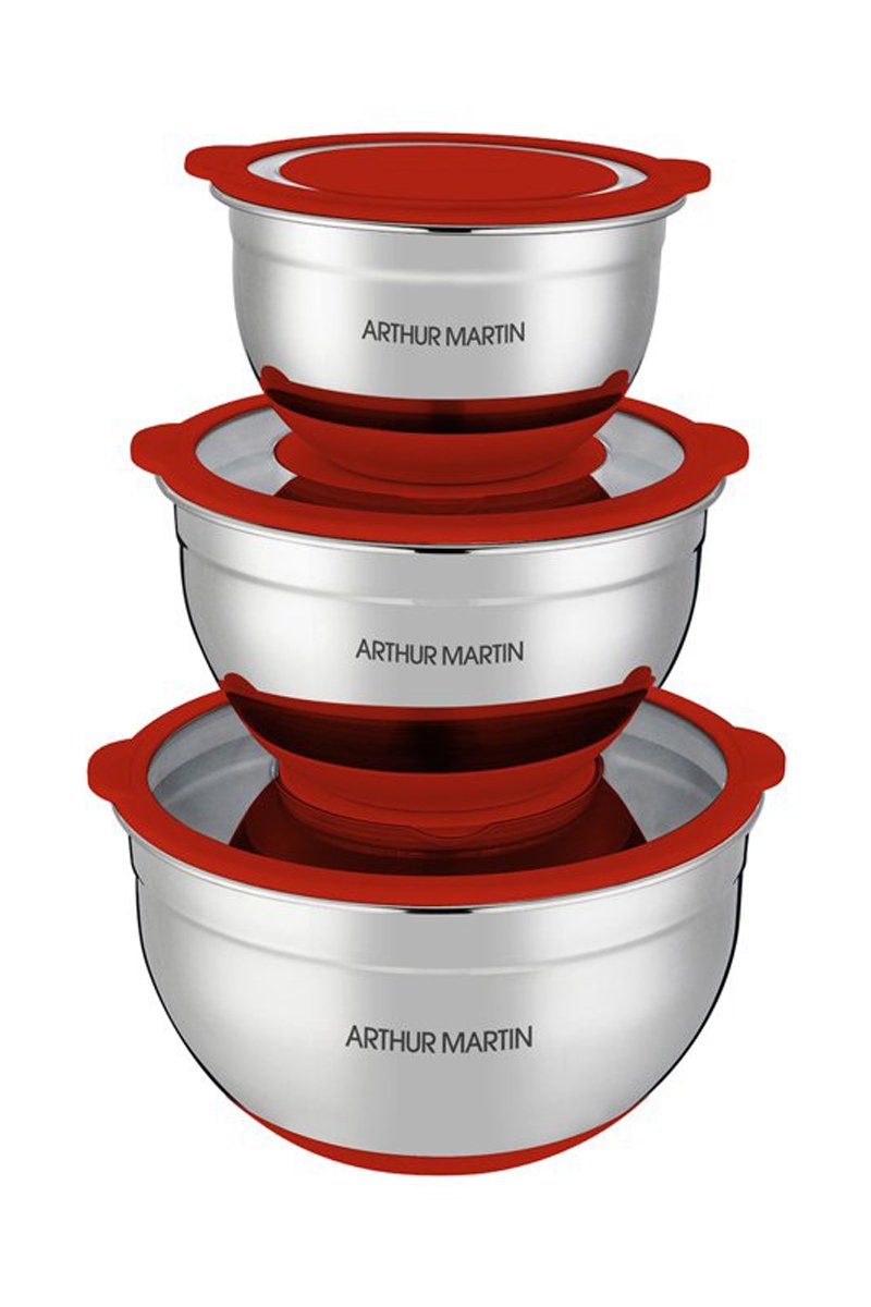 3 bols mélangeurs en acier inoxydable avec couvercle.